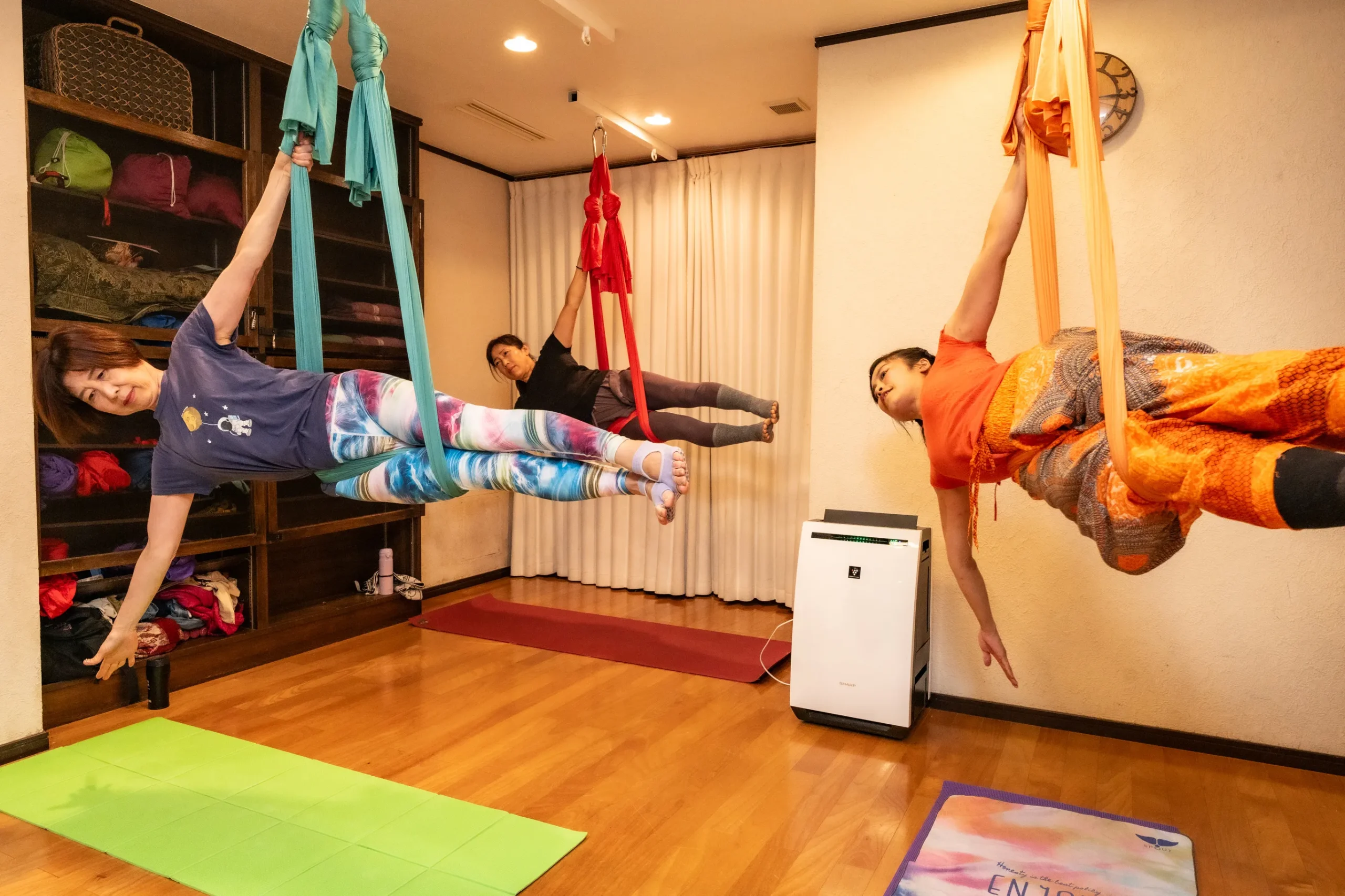 天井から吊り下げた肌触りのいい布に体を乗せて行うヨガ。